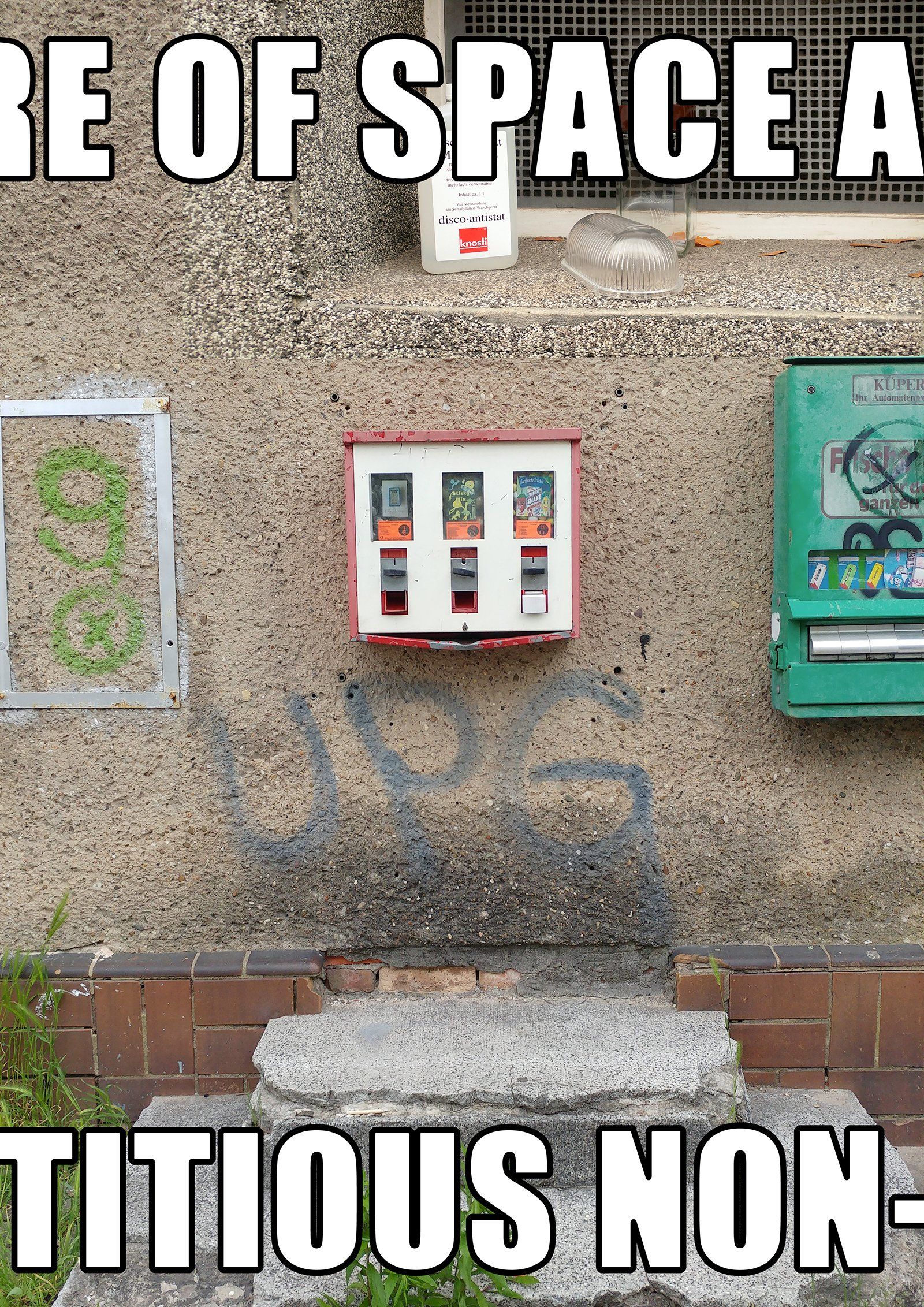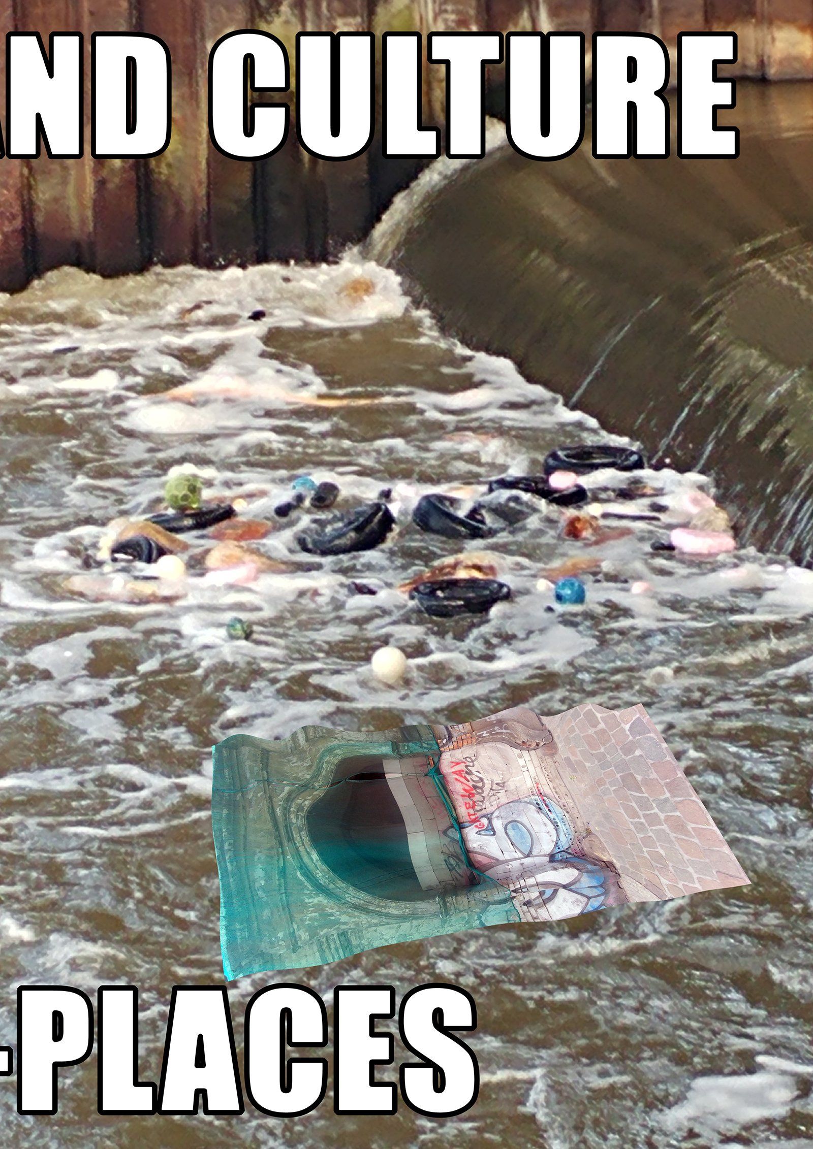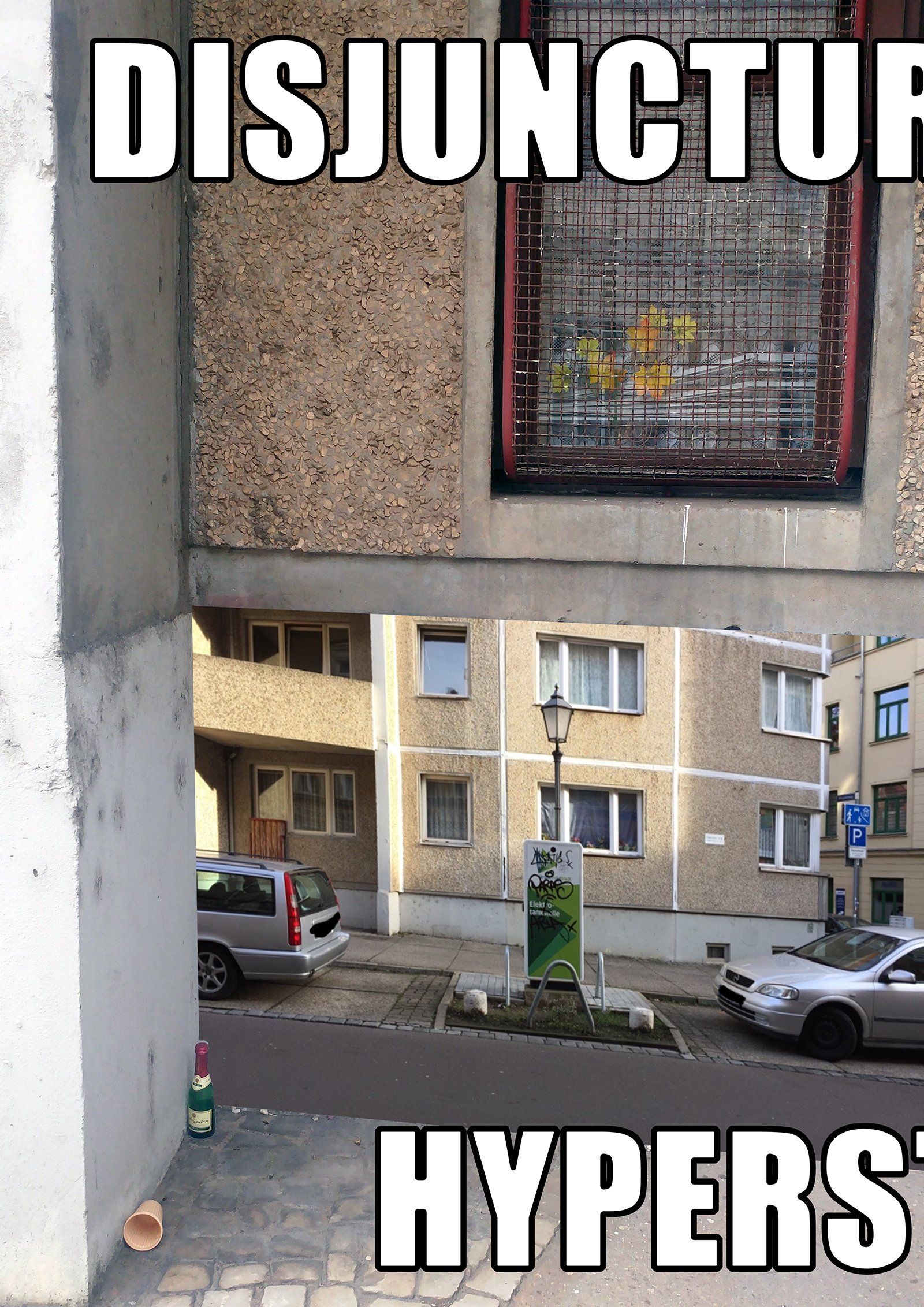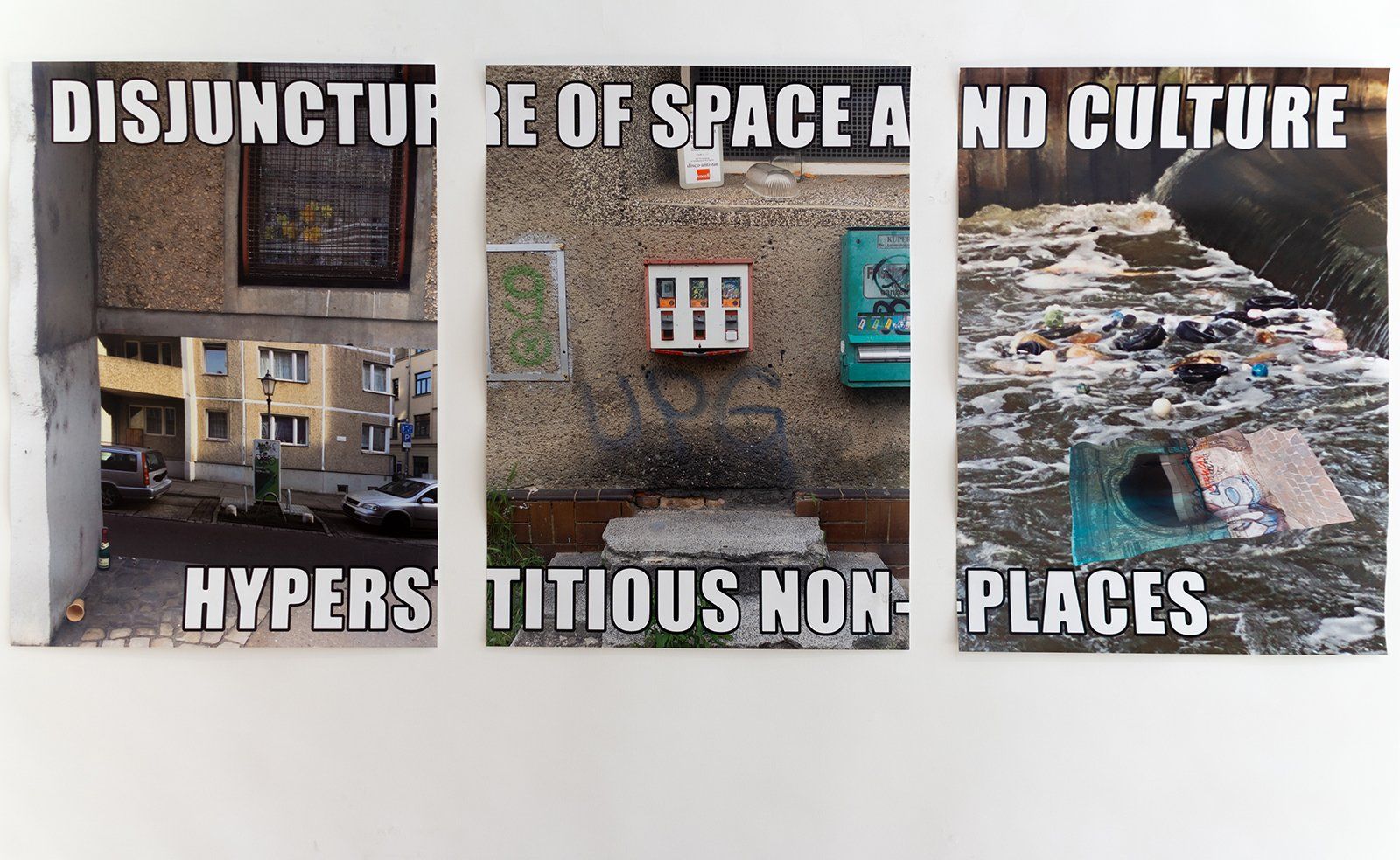 Three digital prints show manipulated images of neglected and untended parts of a cityscape and architecture. All three prints together form a commentary on the displayed situation stylized in a font typical of memes on the internet: "DISJUNCTURE OF SPACE AND CULTURE – HYPERSTITIOUS NON-PLACES".