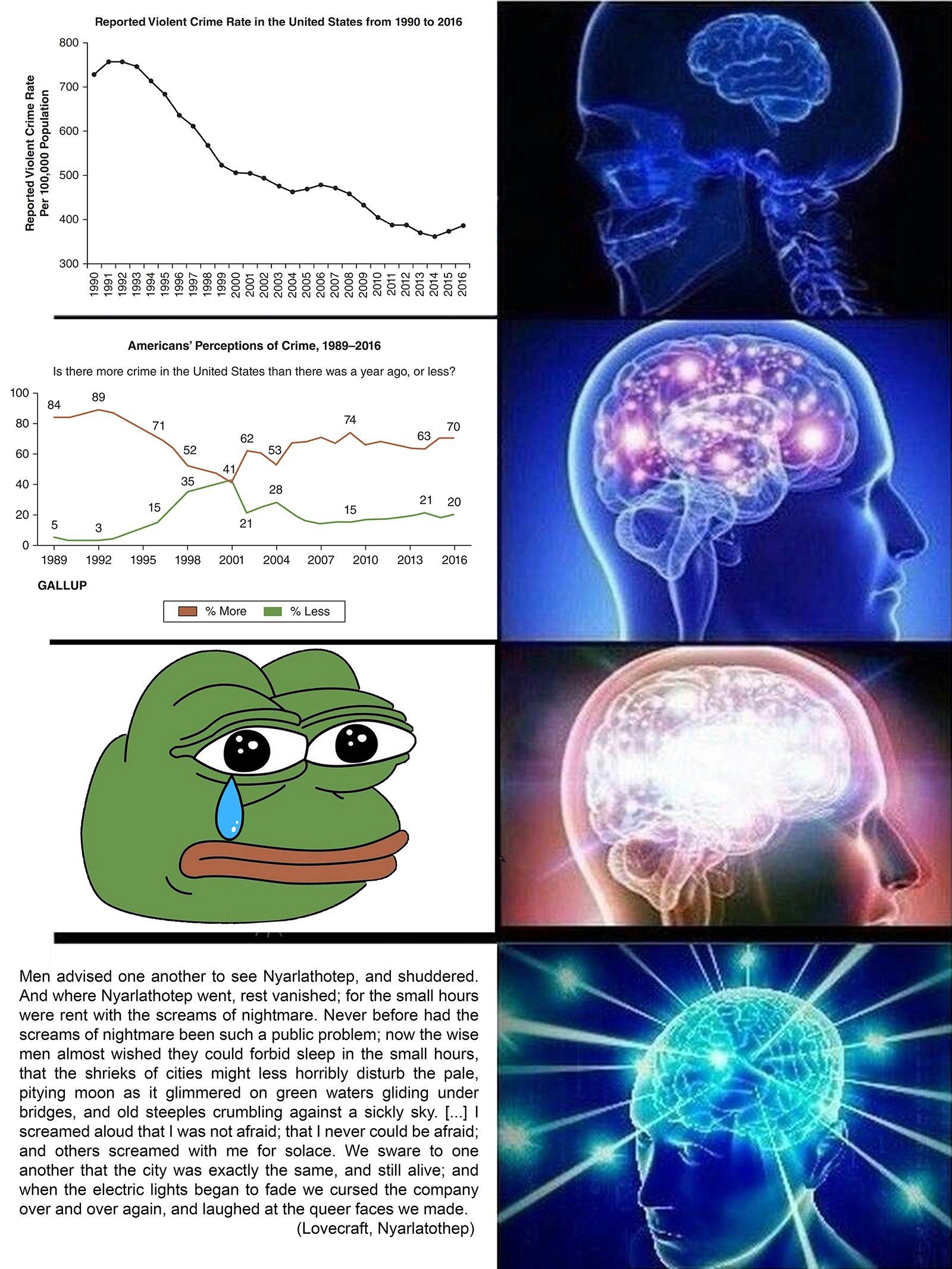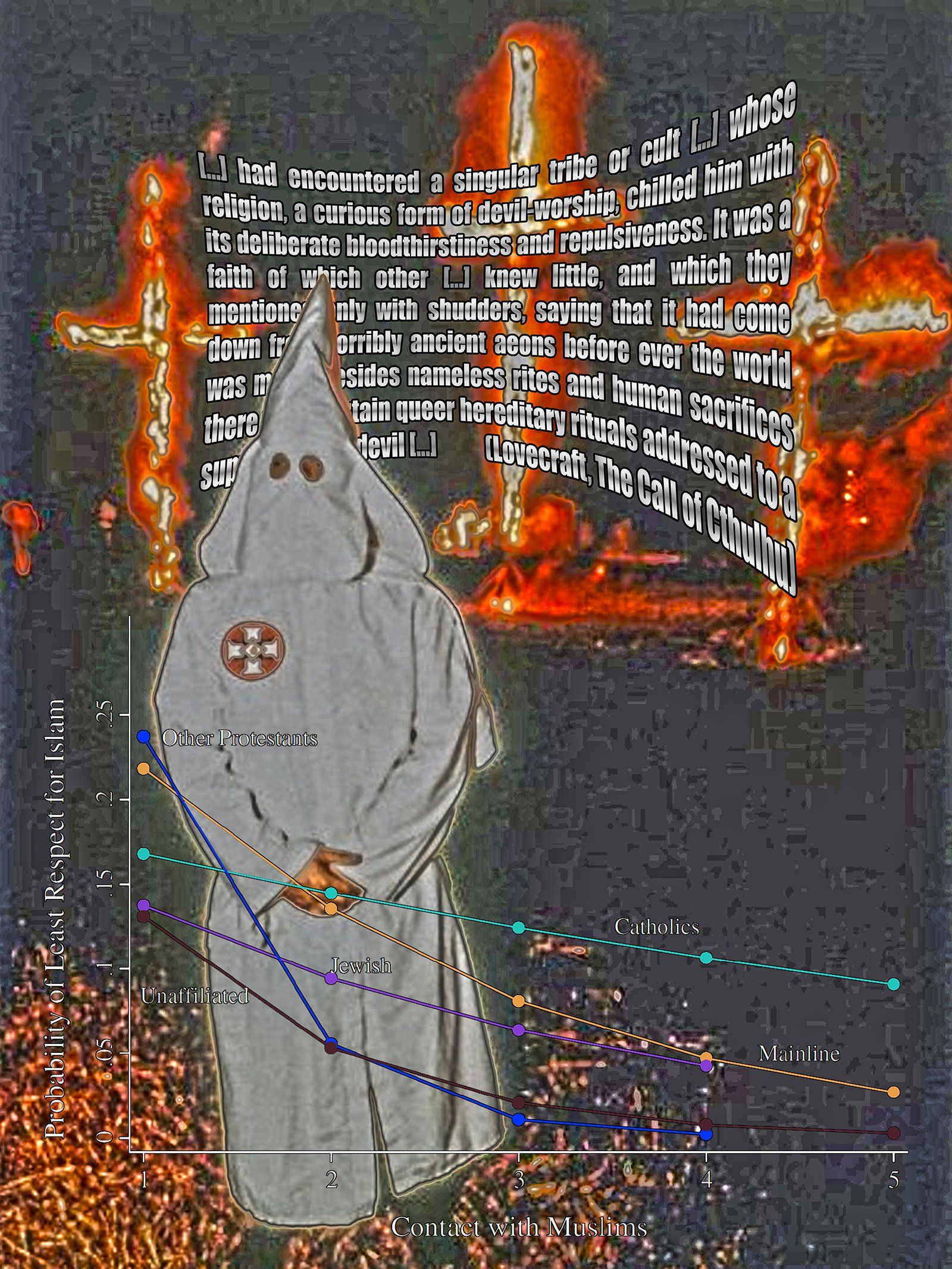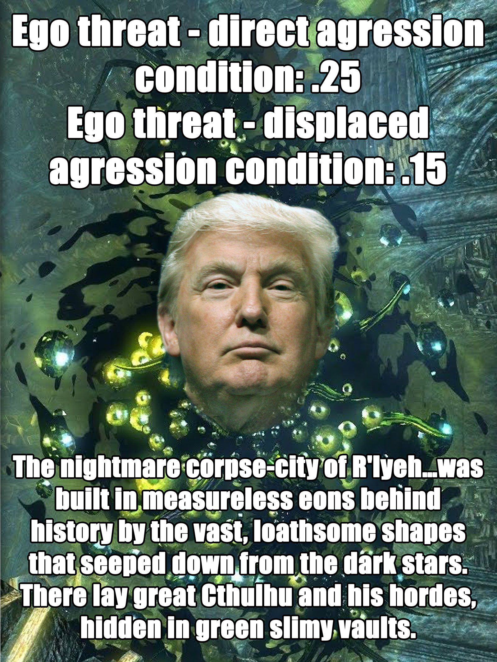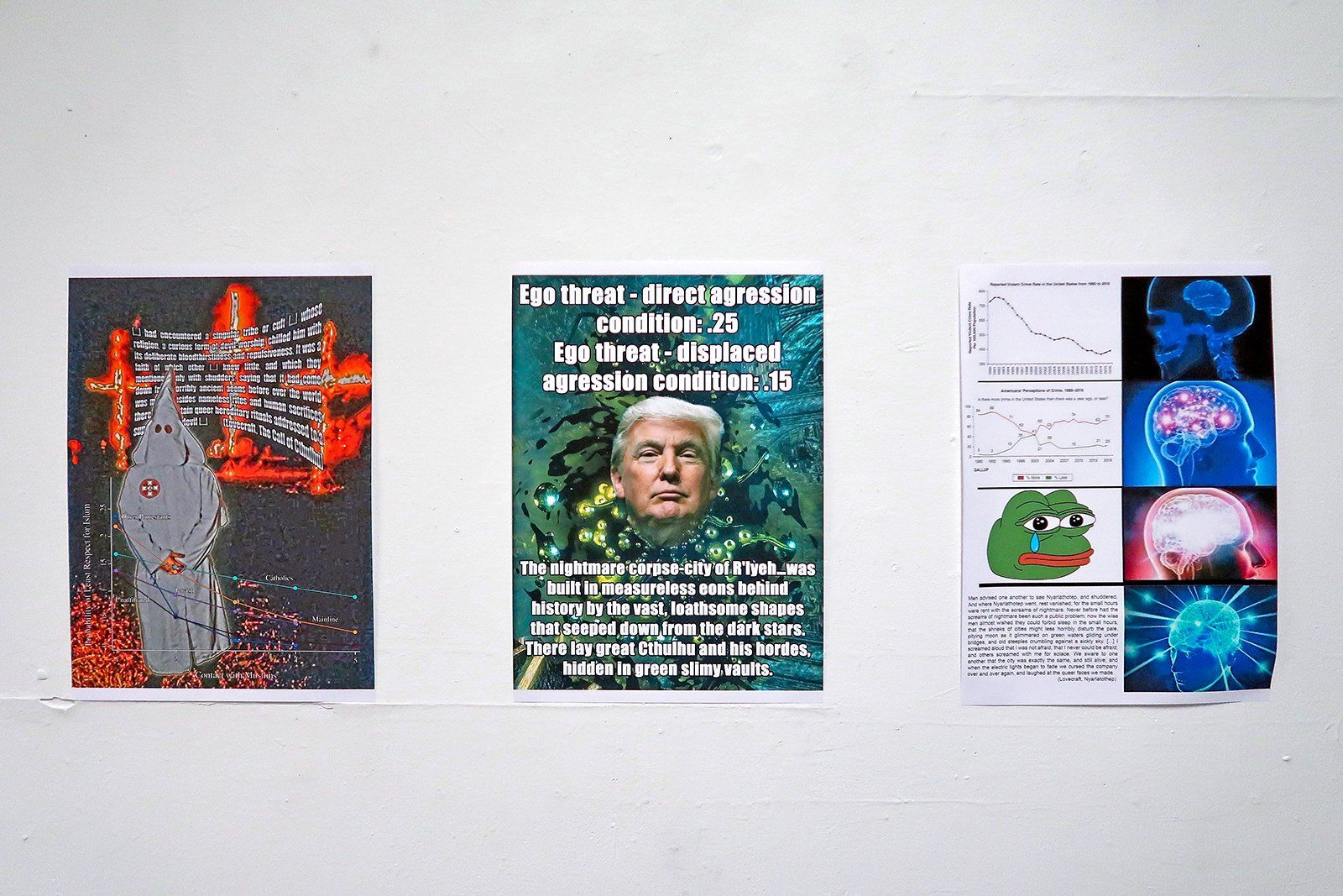 Three digital prints show digital collages, that resort to variations of the formal vocabulary of so-called "memes". In the light of that formal decision, the collages combine political symbols or politically relevant persons with pieces of texts and images sourced from scientific publications as well as from the writings of H. P. Lovecraft. In accordance with digital memetic communication the singular parts of the collages are appropiated from diverse sources and willfully distorted in their original meanings.